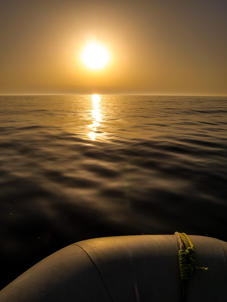 As the sun went down, the wind slowed down too, so we had to use the engine. It was a bit foggy outside, which gave everything a spooky feeling, but everything went fine. There were no big events or amazing sights, except for a beautiful sunrise the next morning.