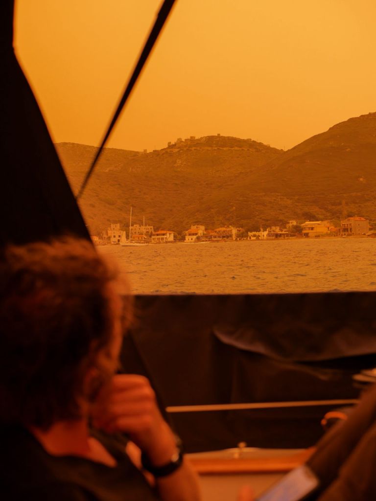 When we arrived at our destination, at Porto Kagio, the sky had a strange yellow tint. It was caused by Sahara dust particles in the air, giving everything an eerie and almost spooky feeling.