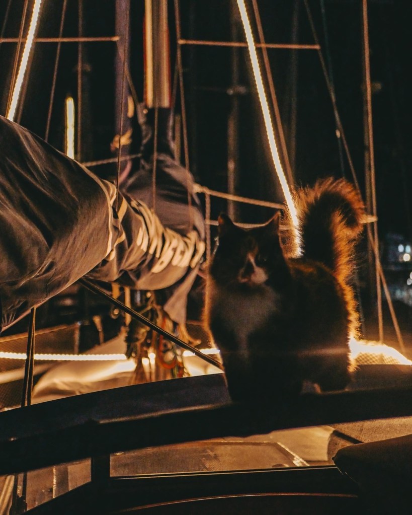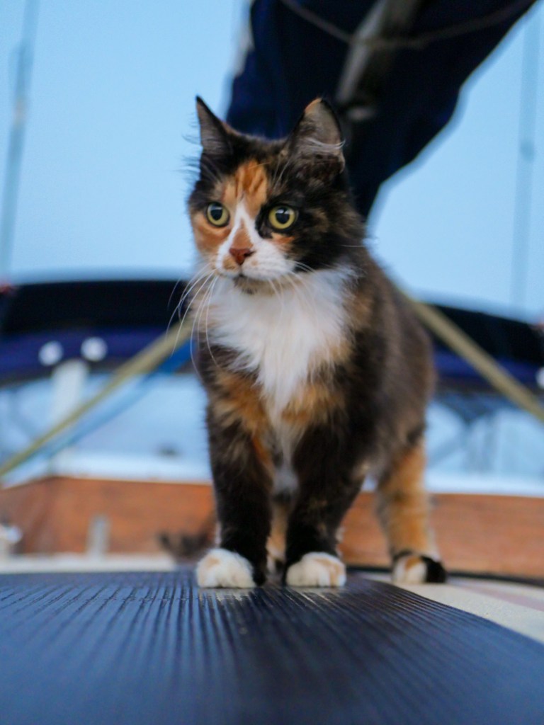 After about two hours, I started feeling seasick. Finn, our cat, also had a rough time and ended up making a mess in his litter box. Cleaning up in the rolling waves wasn’t easy, but we hoped Finn would get used to life on the boat soon.